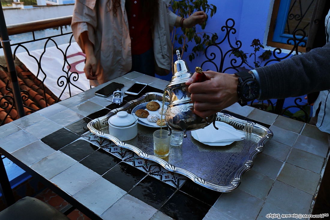 어쨌든 우여곡절 끝에 숙소를 찾고 우리가 가장 먼저 한 일은 체크인을 하는 것이었으나 그것보다 더 중요한 게 있다며 옥상 테라스로 우릴 안내한다. 편안히 잠시만 쉬고 있으라며 사라지더니 금세 이렇게 멋진 웰컴 티를 대접한다. 세상에... 아랍의 환영인사를 받으니 '정말 모로코에 왔구나'하는 실감이 난다. 마치 묘기하듯 차를 따르는 모습에 나도 따라해봤지만 보는 것처럼 쉽지 않다. 그래, 세상에 쉬운 일은 없는 법이다. 아까운 민트차만 쏟았다.