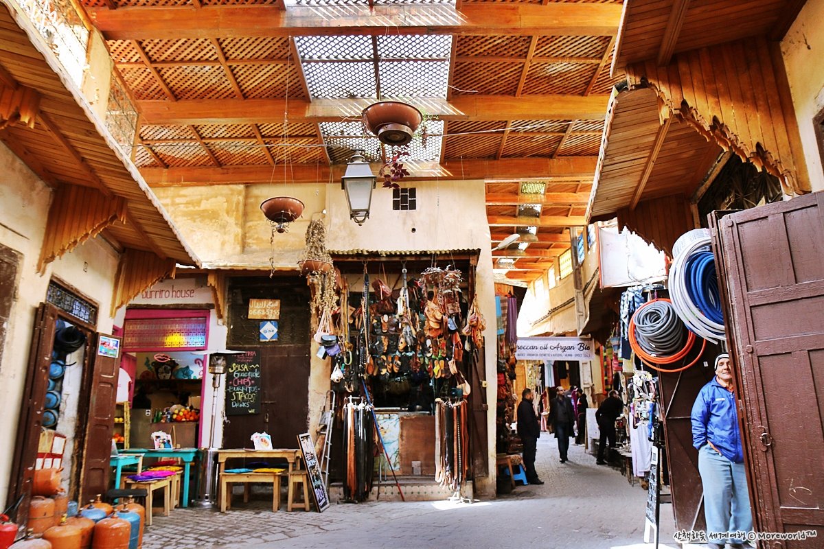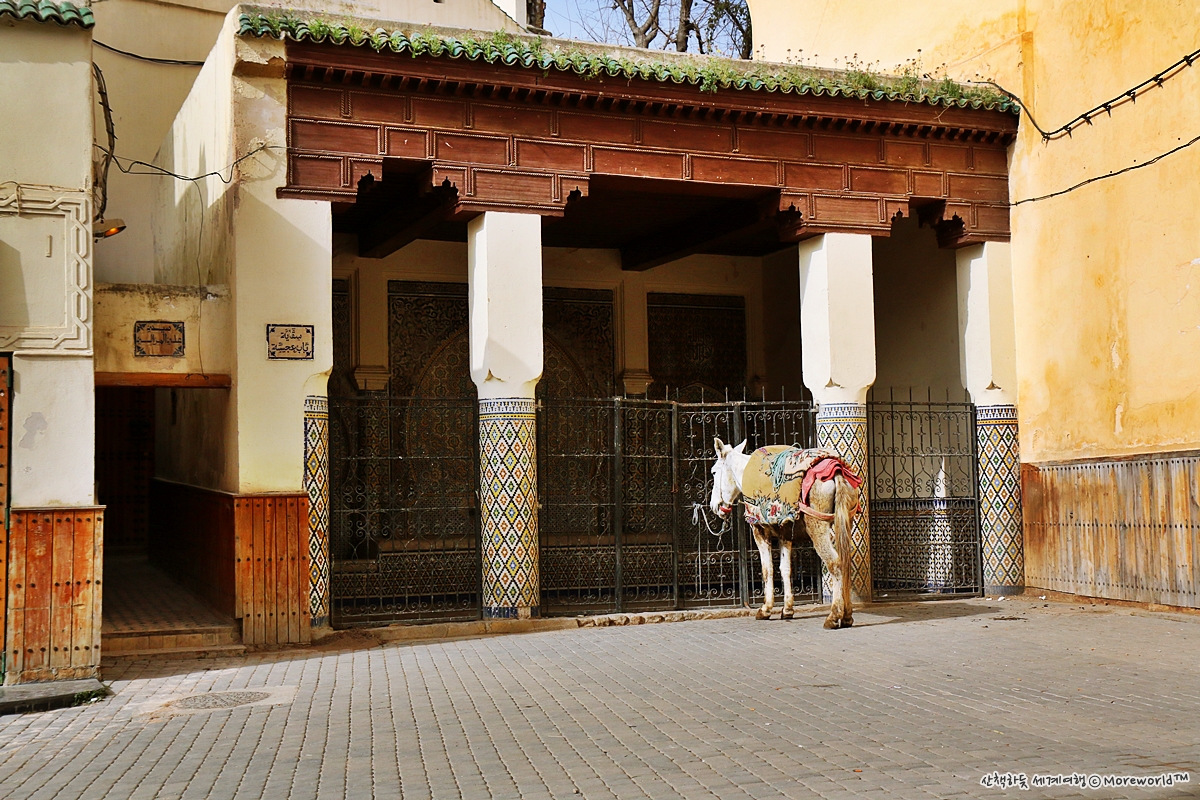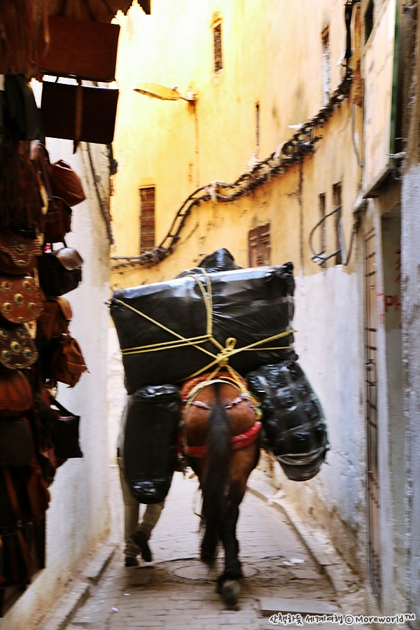 골목이 좁다보니 차는 엄두도 못낼 일, 메디나의 시장 상가에서는 대부분 당나귀로 물건을 옮긴다. 짐을 가득 실은 당나귀가 다가오면 사람들은 홍해가 갈라지듯 양 옆으로 비켜선다. 페스의 메디나는 시간도 비켜간 듯 하다.